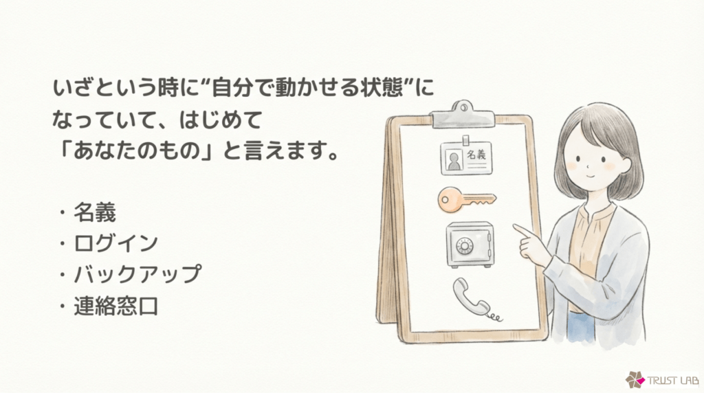 「どこに何があるか」「契約名義や保管先はどうなっているか」を把握しやすい状態へ整えます。
