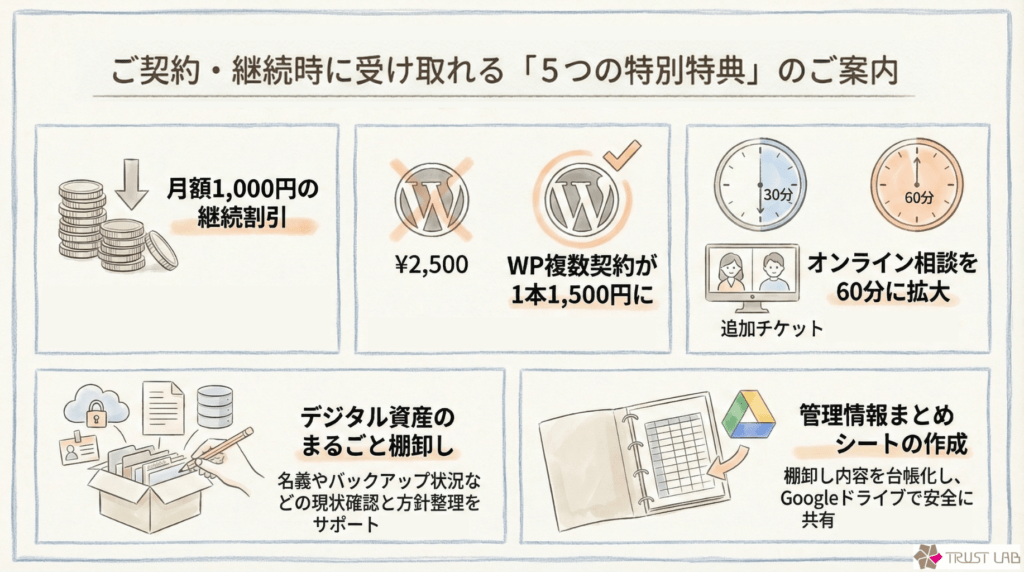 また、契約名義・権限・バックアップ・管理情報の整理は、 お客様のデジタル資産を守るうえで重要な項目として扱っています。